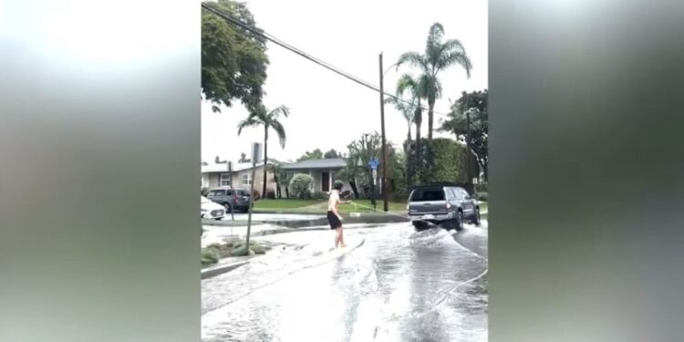 Ένας σέρφερ στη Νότια Καλιφόρνια εκμεταλλεύτηκε τις έντονες βροχοπτώσεις της Δευτέρας έκανε σερφ σε πλημμυρισμένο δρόμο του Λονγκ Μπιτς.