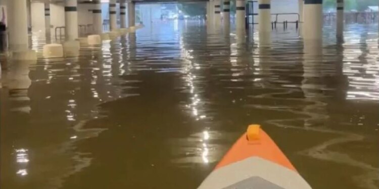 Βίντεο με έναν άνδρα να κινείται με καγιάκ στο πλημμυρισμένο πάρκινγκ καταστήματος E.Leclerc στο Σομίρ (Μαιν-ε-Λουάρ) κάνουν τον γύρο των social media, την ώρα που η δυτική Γαλλία δοκιμάζεται από σφοδρές πλημμύρες.