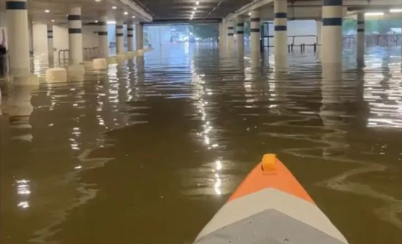 «L’eauclerc, ouais», σχολίασε ειρωνικά χρήστης του Instagram, συνδυάζοντας τη λέξη «eau» (νερό) με το όνομα της αλυσίδας. Στο βίντεο, ο άνδρας διασχίζει το καλυμμένο από νερό πάρκινγκ με καγιάκ, ενώ στο φόντο ακούγεται διαφημιστικό τζινγκλ του σούπερ μάρκετ.