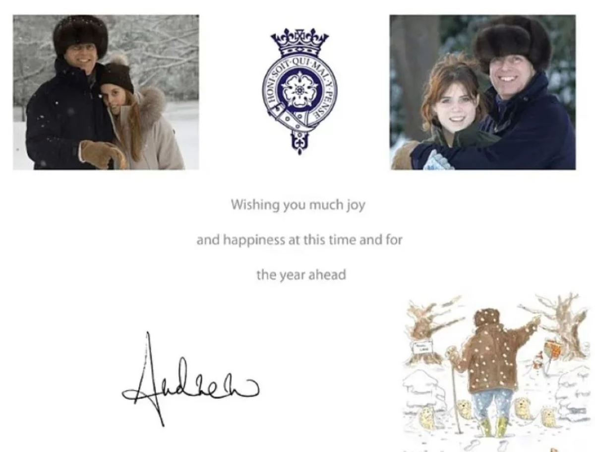 Η πριγκίπισσα Βεατρίκη φωτογραφίζεται φορώντας ένα ασημένιο χριστουγεννιάτικο καπέλο και ωτοασπίδες, ενώ η πριγκίπισσα Ευγενία είναι τυλιγμένη σε ένα γούνινο καπέλο και καφέ κασκόλ. Η ευχετήρια κάρτα περιλάμβανε επίσης μια φωτογραφία του Royal Lodge, του πρώην οικογενειακού σπιτιού στο Ουίδνσορ, καλυμμένου με χιόνι, και κάτι που μοιάζει με τον Άντριου σε ένα κανό.