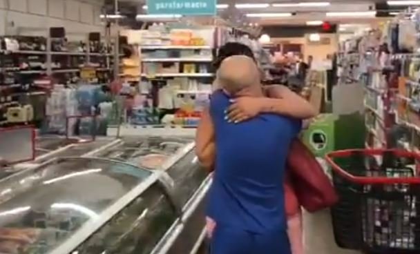 Ακούγονται κατόπιν τα χειροκροτήματα πελατών και υπαλλήλων ενώ η εικόνα μετατοπίζεται στον διάδρομο με τα καθαριστικά, όπου η νεαρή γυναίκα, η Τιτσιάνα Φαμάο, πιάνεται από το καρότσι με τα ψώνια για να μην πέσει κάτω από την έκπληξη.