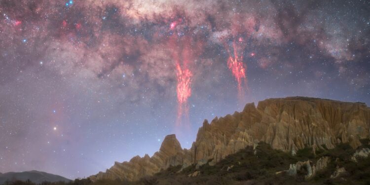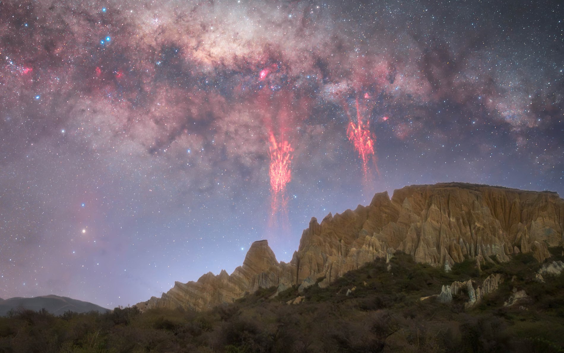 Τρεις φωτογράφοι, ο Νεοζηλανδός Τομ Ρέι και οι Ισπανοί Νταν Ζάφρα και Χοσέ Κανταμπράνα, κατάφεραν να απαθανατίσουν τους κόκκινους κεραυνούς στις 11 Οκτωβρίου, ενώ είχαν βγει να φωτογραφίσουν τον Γαλαξία (Milky Way) στον ουρανό, πάνω από τους πηλώδεις βράχους του Ōmārama.