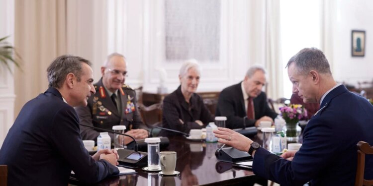 Τον ανώτατο διοικητή του ΝΑΤΟ στην Ευρώπη (SACEUR), πτέραρχο Alexus G. Grynkewich υποδέχτηκε σήμερα ο Πρωθυπουργός, Κυριάκος Μητσοτάκης στο Μέγαρο Μαξίμου.