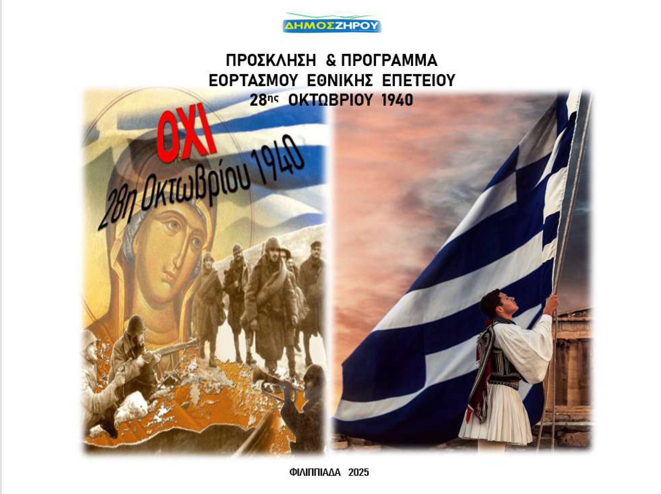 Ο Δήμος Ζηρού σας προσκαλεί να τιμήσετε με την παρουσία σας τις εκδηλώσεις για τον εορτασμό της Εθνικής Επετείου της 28ης Οκτωβρίου 1940. Με σεβασμό και υπερηφάνεια, τιμούμε το ιστορικό “ΟΧΙ” και τους αγώνες του ελληνικού λαού για ελευθερία και εθνική ανεξαρτησία.