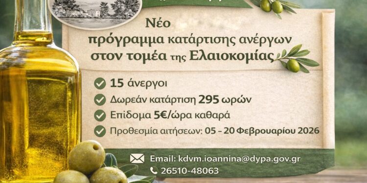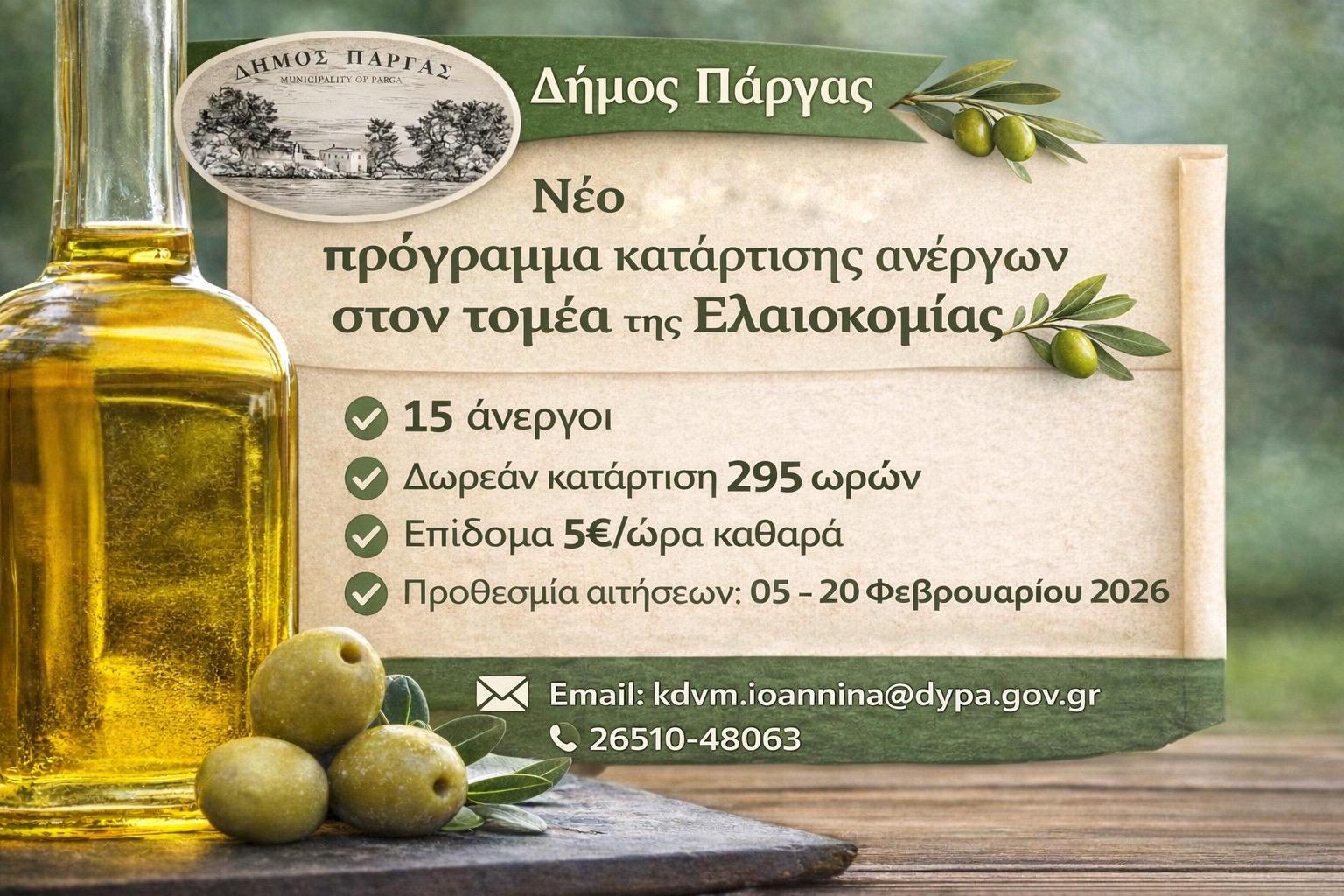 Ο Δήμος Πάργας, στο πλαίσιο των δράσεών του για την ενίσχυση της απασχόλησης και της τοπικής αγροτικής οικονομίας, ανακοινώνει την υλοποίηση νέου επιδοτούμενου προγράμματος επαγγελματικής κατάρτισης ανέργων στον τομέα της ελαιοκομίας, σε συνεργασία με το Κέντρο Δια Βίου Μάθησης (Κ.Δ.Β.Μ.) της Δημόσιας Υπηρεσίας Απασχόλησης (Δ.ΥΠ.Α.) Ιωαννίνων.