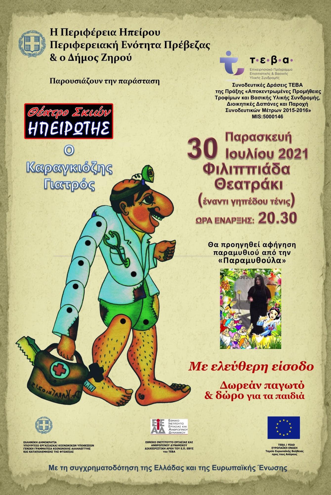 Δύο υπαίθριες εκδηλώσεις και με την τήρηση όλων των προβλεπόμενων μέτρων προστασίας, θα διοργανωθούν την Παρασκευή 30 Ιουλίου και την Κυριακή 1 Αυγούστου. Η πρώτη θα διοργανωθεί στο θεατράκι στην Πλατεία Ανδρέα Παπανδρέου στη Φιλιππιάδα, και αφορά παράσταση Καραγκιόζη. Η εκδήλωση η οποία πραγματοποιείται στο πλαίσιο του προγράμματος ΤΕΒΑ, θα συνδιοργανωθεί από τον Δήμο Ζηρού με την Περιφέρεια Ηπείρου και θ’ αρχίσει στις 8.30 μ.μ.