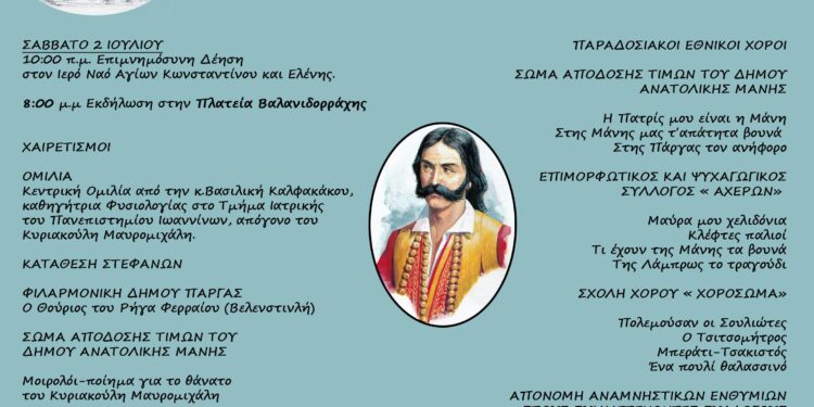 Η εκδήλωση θα πραγματοποιηθεί το Σάββατο 02/07 στις 8:00 μ.μ. στην Πλατεία της Βαλανιδορράχης. Κεντρική ομιλήτρια της εκδήλωσης θα είναι η Ομότιμη Καθηγήτρια κα. Βασιλική Καλφακάκου απόγονος του Κυριακούλη Μαυρομιχάλη.
