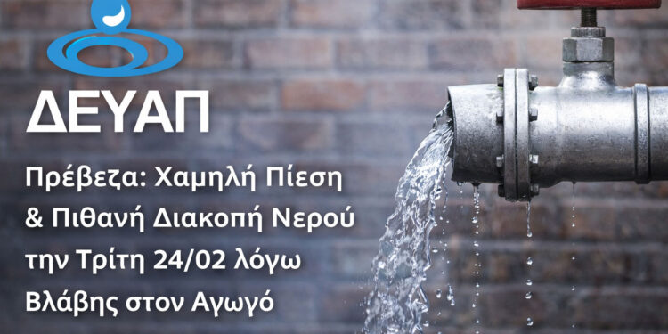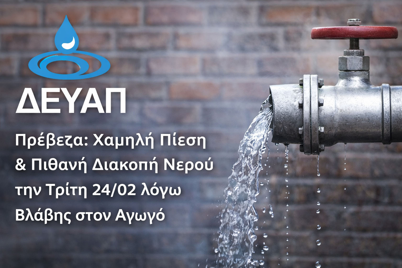 Κάνουμε γνωστό στους καταναλωτές, ότι την Τρίτη 24-02-2026 λόγω εργασιών αποκατάστασης βλάβης στον αγωγό ύδρευσης του Συνδέσμου Λευκάδας – Αιτωλοακαρνανίας από τις πηγές του Αγίου Γεωργίου – Δ.Ζηρού, κατά την διάρκεια της ημέρας και έως ότου αποκατασταθεί η βλάβη, θα υπάρξει χαμηλή πίεση και πιθανή διακοπή στο δίκτυο ύδρευσης της Πρέβεζας.