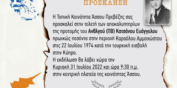 Ήταν σαν σήμερα στις 22 Ιουλίου 1974 όταν ο εξ Άσσου Πρεβέζης καταγώμενος Ανθυπολοχαγός (ΠΒ) Κατσάνος Ευάγγελος του Κωνσταντίνου πέρασε στην αιωνιότητα καθώς έπεσε ηρωϊκώς, πολεμώντας τον βάρβαρο εισβολέα στην περιοχή Καραόλου Αμμοχώστου της Κύπρου.