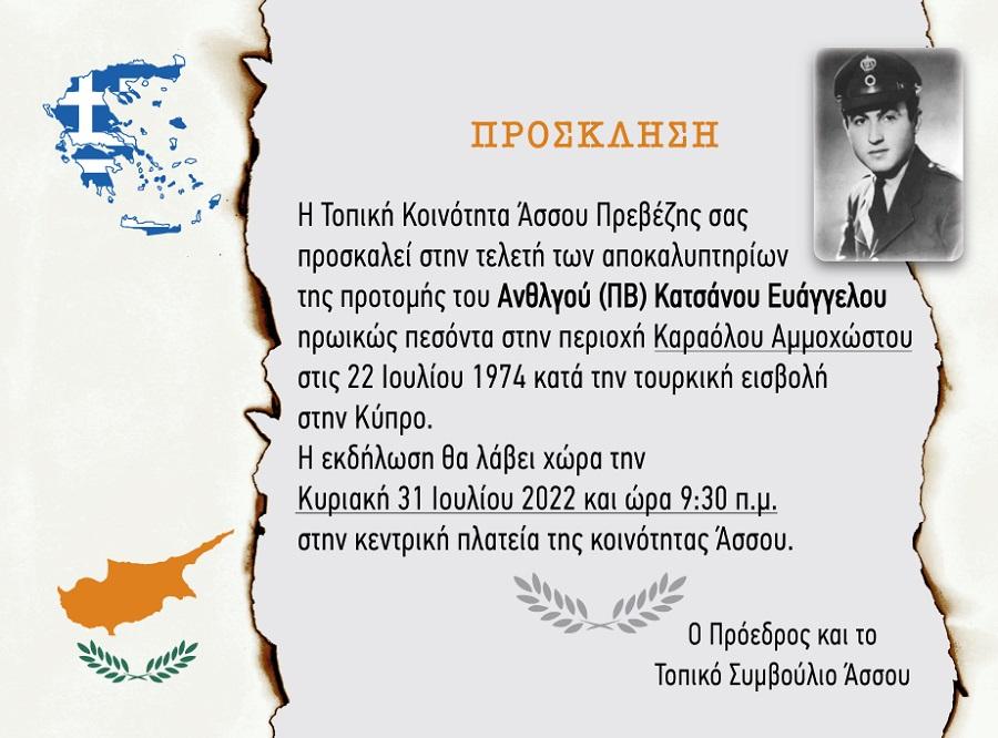 Ήταν σαν σήμερα στις 22 Ιουλίου 1974 όταν ο εξ Άσσου Πρεβέζης καταγώμενος Ανθυπολοχαγός (ΠΒ) Κατσάνος Ευάγγελος του Κωνσταντίνου πέρασε στην αιωνιότητα καθώς έπεσε ηρωϊκώς, πολεμώντας τον βάρβαρο εισβολέα στην περιοχή Καραόλου Αμμοχώστου της Κύπρου.