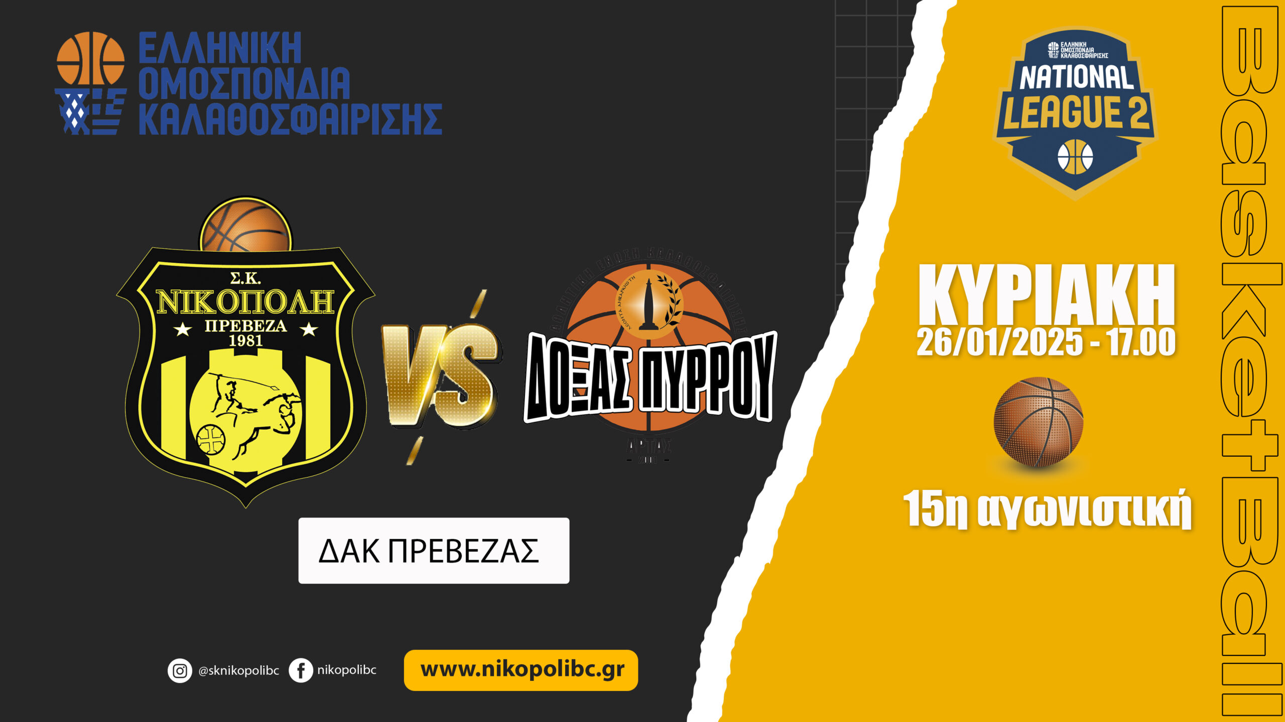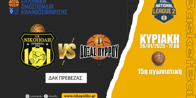 Την Δόξα Πύρρου Άρτας υποδέχεται η Νικόπολη για την 15η αγωνιστική του πρωταθλήματος της National League 2, την Κυριακή 26 Ιανουαρίου στις 17.00 στο ΔΑΚ Πρέβεζας.