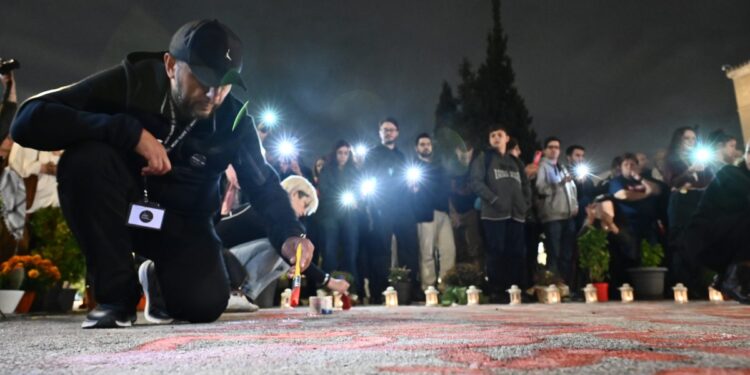 Κατά τη διάρκεια της συγκέντρωσης, οι συγγενείς των θυμάτων της τραγωδίας στα Τέμπη ξανάγραψαν με κόκκινη μπογιά τα ονόματα των νεκρών μπροστά στο μνημείο, σε μια συμβολική πράξη μνήμης και διαμαρτυρίας.